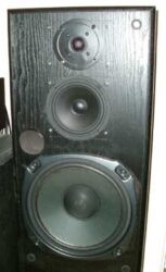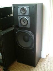 My Review: Yet Again I have little idea what the media said. They were not so expensive as far as speakers are concerned. They were a 3 way setup with 25cm bass cones. They standed 858mm tall. The sound is a little too glaring sometimes, but it is hard to know if this is the fault of the amp (etc). They can play quiet but they have real abilities to pump out the bass. In the picture I have taken the grills off, but usually they run with black grills over the speakers.